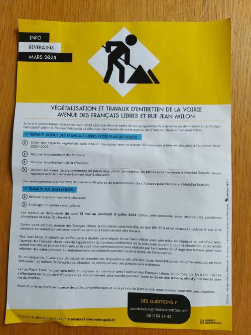 Aucun retour formel ou informel n’a été effectué vers le groupe Projet. Pourtant, les premiers travaux sur les réseaux de l’avenue des Français Libres ont été constatés dès début avril, et une information distribuée aux riverains le 24 avril, présentant le « projet final »