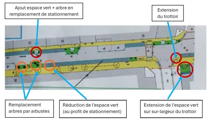 NB : Sur le trottoir coté Sud, les zones végétalisées sont envisagées en remplacement partiel d'espaces de stationnement, ce qui va dans le bon sens, mais sans modifier la configuration du trottoir. Or les arbres actuels sont implantés de telle sorte qu'il y a du bitume de chaque coté : un espace plus large le long de la façade des batiments, et un espace plus étroit coté rue. Cette bande étroite de bitume serait à intégrer dans les espaces verts, élargis pour rejoindre les pieds d'arbre, le passage coté façade étant suffisant