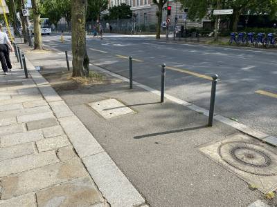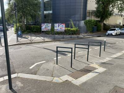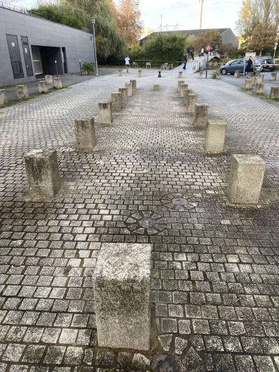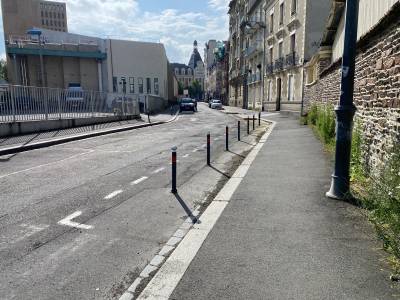 | Rue Mgr Duchesne | photos | Présence du végétal / Ombrage | Arbres | Végétaliser l'espace central de la voirie, neutralisé par des plots béton, dans l'axe de la passerelle | |