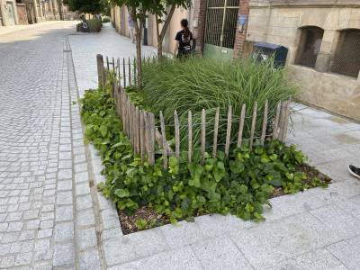 | Rue Duhamel - Angle “Moulins de Rennes” | photo | Présence du végétal / biodiversité | Bosquet | Végétation basse (bosquets ou au moins couvre-sols) en remplacement de la zone bitumée désormais limitée par des potelets (condamnation d'espace de stationnement sauvage) | |