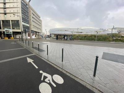 | Place de la Gare - Hotel Ibis | photos | Bosquet | Ajout de végétation en fosse ou bacs (selon contraintes techniques) sur la pointe inutilisée entre les voies de circulation devant l'hotel Ibis | Pas envisageable technique à ce stade. Le projet d'aménagement du parvis visait à dégager la vue sur la gare, avec un aspect de “lande”, végétation basse uniquement | |