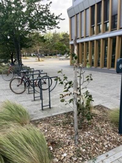 | Allée Georges Palante | photos | Présence du végétal / Biodiversité | Bosquet | Prolonger jusqu'à la rue l'alignement végétal bordant l'espace des deux rives à l'Est, en déplaçant les appuis vélos devant la façade Sud | |